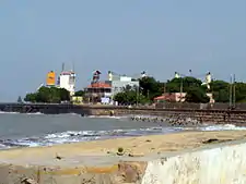 Bet Dwarka, an island in the Arabian sea off the coast of Dwarka. Considered the original residence of Krishna, Bet Dwarka was the old port during the ancient times of Krishna before the Okha port was developed in Dwarka. The temple built here is credited to the religious Guru Vallabhacharya of the "Pushtimarg Sampradaya". Rice is the traditional offering here to the deity as it is believed that Sudama offered rice to his childhood friend Krishna. There are also smaller shrines on Bet Dwarka which are dedicated to Shiva, Vishnu, Hanuman and Devi.[42] According to a legend, Vishnu killed the demon Shankhasura on this island. There are temples of Vishnu in the incarnation of matsya, or fish. Other shrines here are of Rukmini, Trivikrama, Devaki, Radha, Lakshmi, Satyabhama, Jambavati, Lakshmi Narayan, and many other gods.[39].Hanuman Dandi temple is another notable temple located in Bet Dwarka, 6 kilometres (3.7 mi) away from Dhwarkadhish Temple, Bet Dwarka. The temple is deified with many images of Hanuman and his son Makardhwaja. The legend associated with the birth of a son to Hanuman, who is considered celibate, is that the sweat of Hanuman was consumed by a crocodile which then gave birth to a son named Makardhwaja.[42] The Jethwa Rajput clan of Kshatriyas claim their descent from Makardhwaja.