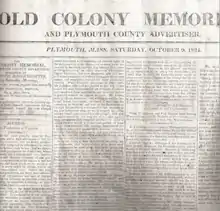 - ↑ Old Colony Memorial, and Plymouth County Advertiser, Vol. 1, no. 1 (May 4, 1822). Library of Congress. "About Old Colony memorial, and Plymouth County advertiser. (Plymouth, Mass.) 1822-1827". Chronicling America: Historic American Newspapers. Retrieved 22 April 2012.