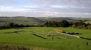 Old Sarum Cathedral was a Catholic and Norman cathedral at old Salisbury, now known as Old Sarum, between 1092 and 1220. Only its foundations remain, in the north-west quadrant of the circular outer bailey of the site, about 2 miles (3.2 km) north of the centre of modern Salisbury, Wiltshire, in the United Kingdom. The cathedral was the seat of the bishops of Salisbury during the early Norman period and the original source of the Sarum Rite.
