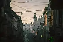 ![]() City view from High Castle, the couple of green domes (center) – ensemble of the Assumption Church, tower on the far right – Town Hall on the Market Square | |