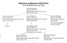 Four related Oliphants, three Andersons and two Ferriers were involved with this firm at some stage. Isobel Steel Oliphant (born 1873), the daughter of William Oliphant III, married Walter Gowanlock Anderson (1866–1914), the eldest son of Robert Anderson, in 1896. These family connections with the firm effectively ended when Walter Oliphant II (1867–1933), an Edinburgh solicitor, sold his shares in Oliphants Ltd in 1920.[5]
