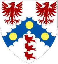 Argent on a chevron engrailed Azure between in chief two eagles displayed and in base three martlets Gules three Bezants.