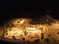 The Altis was an irregular quadrangular area more than 183 m (200 yd) on each side and walled except to the North where it was bounded by the Kronion (Mount Kronos).[6] It consisted of an arrangement of buildings, the most important of which are the Temple of Hera (or Heraion/Heraeum), the Temple of Zeus, the Pelopion, and open sites used for traditional activities, such as the area of the great altar of Zeus, where the largest sacrifices were made.[note 4]