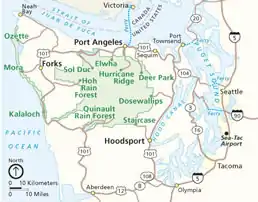 The Olympic Peninsula is a large arm of land in western Washington that lies across Puget Sound from Seattle, and contains Olympic National Park. It is bounded on the west by the Pacific Ocean, the north by the Strait of Juan de Fuca, and the east by Hood Canal. Cape Alava, the westernmost point in the contiguous United States, and Cape Flattery, the northwesternmost point, are on the peninsula. Comprising about 3,600 square miles (9,300 km2), the Olympic Peninsula contained many of the last unexplored places in the contiguous United States. It remained largely unmapped until Arthur Dodwell and Theodore Rixon mapped most of its topography and timber resources between 1898 and 1900.[1]