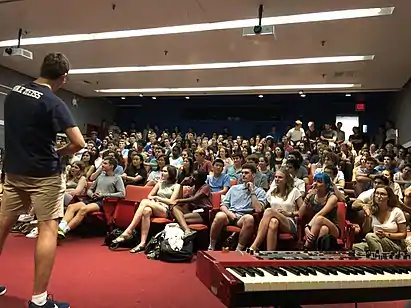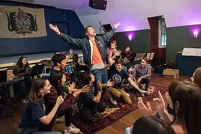 Founded in 1984 by Brigit Fasolino Vucic, On Thin Ice is Harvard's oldest improv troupe.[1][2] Shows performed once every few weeks, are about 45 minutes long and depend on audience suggestions. OTI's constitution requires that they perform free on-campus shows. OTI is famous for their Trial By Fire show, a showcase for their newest members. Performed once each semester, the Trial By Fire show requires all new members, having only had one practice, to perform in every game. Additionally, they have competed in a number of short-form improv comedy competitions across the country and travel locally and nationally performing for numerous events and organizations.[3][4] And every year, during the Harvard-Yale football game weekend, OTI performs with an improv troupe from Yale.[5]