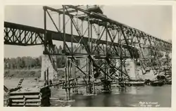 Before the outbreak of World War II in 1939, a new bridge spanning the Nipigon River was completed alongside a 91.6 km (56.9 mi) highway eastward to Schreiber. Both were opened together ceremoniously on September 24, 1937.[21] When the war began, construction on Highway 17 halted,[9] with effort instead focused on the simpler northern route via Geraldton and Hearst.[22]
