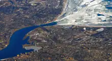 Aerial view of Highway 402 passing through Sarnia; the Blue Water Bridge is visible. Lake Huron, to the upper right, is largely covered in ice.