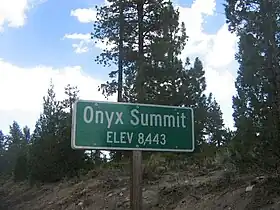 Onyx Summit is a mountain pass located in the San Bernardino Mountains in the southwestern part of San Bernardino County, California, United States. At an elevation of 8,443 ft. (2,573 m), it is the highest mountain pass in Southern California. California State Route 38 traverses it at postmile 39.37 in the eastern part of San Bernardino National Forest.