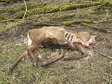 The reserve is the subject of decades of management reports[10][11][12] and protests[13][14] against the large reported number of grazers dying by starvation or shot to death,[15][16] while the animals are kept behind a fence and cannot migrate.[17] During a particularly harsh winter in 2005, many animals in the Oostvaardersplassen died of starvation, leading to public outcry against alleged animal cruelty and leading to the culling strategy.[18] In the winter of 2017–2018, almost 3.300 deer, horses and cattle starved to death[19] dividing[20] the Dutch public[21] and leading to demonstrations and individuals feeding hay to the animals despite police arrests.[22][14]