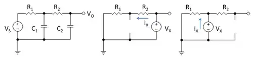 2. Select capacitor C2, replace it by a test voltage VX, and replace C1 by an open circuit. Then the resistance seen by the test voltage is found using the circuit in the middle panel of Figure 1 and is simply VX / IX = R1 + R2. Form the product C2 ( R1 + R2 ).