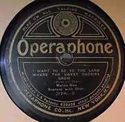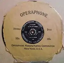 The Operaphone Manufacturing Corporation of New York was established by John Fletcher, a professional musician and amateur inventor, in 1914 with George Thomas serving as company president.[1][2] A pressing plant in Long Island City was soon established.[2] Fletcher claimed in a trademark application that he had first used the name Operaphone beginning in March, 1915.[2] Advertising for Operaphone discs first occurred in January 1916, offering 8-inch discs for 35 cents.[1] 12 new discs (24 titles) were released each month.[1] Operaphone claimed their output of discs tripled between January and August 1916.[2] The price of the 10-inch records had been increased to $1.00 by July 1920.[1] The company was reorganized in 1918 as the Operaphone Co., Inc. Eight-inch records were discontinued, some 200 having been produced, and a standard-size 10-inch series of discs was announced, but the records remained vertically cut.[2] This series also failed to capture the public's imagination (and wallets), and a final series of 10-inch records was introduced in July 1919. These discs used Emerson's universal-cut system, which were intended to be playable phonographs using either the vertical or lateral reproducers.[2] These met with the most success, as they are the most commonly-found Operaphone products.[2] In March 1921 it was announced in the trade publication Talking Machine World that Operaphone would quit the record business.[1] The company was purchased by the Remington Phonograph Company, and it was reorganized as the Olympic Disc Record Company.[1] Subsequently, Harry Pace partnered with Fletcher to bring use of the Operaphone pressing facility to the new Black Swan Records.[3]