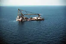 ![]() A U.S. Navy crewman stands atop the cabin of a PB Mark III patrol boat tied up to the oil rig service barge Wimbrown VII in the northern Persian Gulf. From lower to upper right, the barge is armed with a .50-caliber M2 machine gun, an 81 mm Mark 2 mortar, and a 40 mm Mk 19 grenade launcher. | |