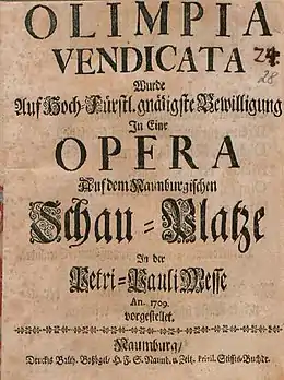 | Olimpia Vendicata | Heinichen | Georg Christian Lehms[6] | 1708 | Revival in 1709, some arias preserved; the only completely Italian-language opera from Naumburg. |