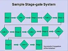 The stage-gate process was created because the traditional organisational structure is primarily for top-down, centralized control and communications, all of which are not practical for organizations that use project management and horizontal workflow. The stage-gate process evolved into life-cycle phases.[17] Stages are phases of the decision-making process where development work is completed. Phase–gate systems divide the innovation process into a predetermined set of stages composed of a group of "prescribed, related, and often parallel activities." Most Phase–gate systems involve four to seven stages.[18] Since each proceeding stage is more expensive than the previous, it is imperative that a high degree of research-backed discrimination is involved in passing stages. The body of research collected for proposed initiatives should be frequently consulted to adequately support the decision-making processes.