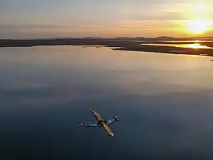 The Orbital O2 was constructed in Dundee, Scotland[9][10] by Texo Group.[11] It was launched from the city into the Tay Estuary on 22 April 2021 via a submersible barge. This turbine has twin 20 m diameter rotors, a 72 m long hull, and weighs 680 tonnes.[12] It was towed to the Fall of Warness site in April and grid connected in July 2021.[6]