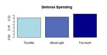 Color or grayscale gradation can be used to represent the ordered nature of the data. A single-direction scale, such as income ranges, can be represented with a bar chart where increasing (or decreasing) saturation or lightness of a single color indicates higher (or lower) income. The ordinal distribution of a variable measured on a dual-direction scale, such as a Likert scale, could also be illustrated with color in a stacked bar chart. A neutral color (white or gray) might be used for the middle (zero or neutral) point, with contrasting colors used in the opposing directions from the midpoint, where increasing saturation or darkness of the colors could indicate categories at increasing distance from the midpoint.[15] Choropleth maps also use color or grayscale shading to display ordinal data.[16]