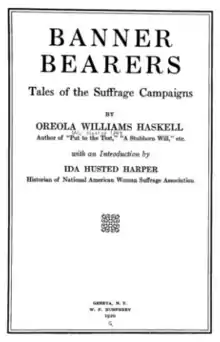 Until her later marriage with Robert H. Haskell, Haskell worked as a public school teacher in Brooklyn.[29] Together they had a daughter, Grace Vivian Haskell. Haskell was a prolific author, writing her own novel (see Banner Bearers below) and contributing to magazines such as Judge regularly. Haskell was devoted to the suffrage cause, and worked alongside famous suffragists such as Carrie Chapman Catt and Mary Garrett Hay.[30] Ida Husted Harper, who wrote the introduction to Banner Bearers, commended her for her modesty and lack of interest in the limelight,[31] which was very much in line with the self-sacrificing attitude that Haskell attributed to suffragists in her works. Her quiet, efficient, hardworking attitude was also noted in an interview she had with the Brooklyn Daily Eagle in 1915, as a prime example of the faceless army of diligent suffragists who worked behind the scenes.[32] Alongside her suffrage activism and high society work (predominantly philanthropy), she was an auditor and recording secretary of the New York Federation for Women's Clubs, and as of 1914 she was the patroness of the Brooklyn Sittig Christmas Tree Society.[33] Though her contributions to the suffrage movement in New York have not garnered much attention from historians, her plethora of appearances in the Brooklyn Daily Eagle newspaper suggest that she was a well-known and respected figure of the time.
