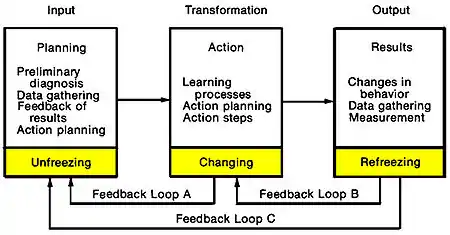 The third stage of action research is the output, or results, phase. This stage includes actual changes in behavior (if any) resulting from corrective action steps taken following the second stage. Data are again gathered from the client system so that progress can be determined and necessary adjustments in learning activities can be made. Minor adjustments of this nature can be made in learning activities via Feedback Loop B (see Figure 1). Major adjustments and reevaluations would return the OD project to the first, or planning, a stage for basic changes in the program. The action-research model shown in Figure 1 closely follows Lewin's repetitive cycle of planning, action, and measuring results. It also illustrates other aspects of Lewin's general model of change. As indicated in the diagram, the planning stage is a period of unfreezing, or problem awareness.[22] The action stage is a period of change, that is, trying out new forms of behavior in an effort to understand and cope with the system's problems. (There is inevitable overlap between the stages since the boundaries are not clear-cut and cannot be in a continuous process). The results stage is a period of refreezing, in which new behaviors are tried out on the job and, if successful and reinforcing, become a part of the system's repertoire of problem-solving behavior.