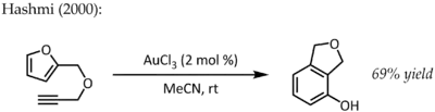 This particular reaction demonstrated fantastic catalytic efficiency and would trigger a flurry of research into the use of phosphinegold(I) complexes for the activation C-C multiple bonds in the years to come.[20] In spite of the lower stability of gold(III) complexes under catalytic conditions, simple AuCl3 was also found to be an efficient catalyst in some cases. For instance, Hashmi reported an AuCl3-catalyzed alkyne / furan Diels–Alder reaction - a type of cycloaddition that does not ordinarily occur - for the synthesis of 2,3-disubstituted phenols:[21]