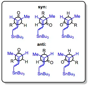 With the allylstannane and aldehyde in high-temperature conditions, addition proceeds through a six-membered, cyclic transition state, with the tin center serving as an organizing element. The configuration of the double bond in the allylstannane controls the sense of diastereoselectivity of the reaction.[4]