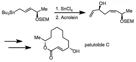 The chiral allylic stannane 1 adds to acrolein to yield the 1,5-syn diastereomer as a single stereoisomer. A subsequent sigmatropic rearrangement increased the distance between the stereocenters even further. This step was carried out en route to (±)-patulolide C.[16]