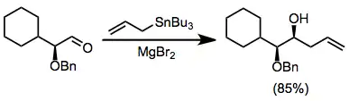 The use of chiral electrophiles is common and can provide "double diastereoselection" if the stannane is also chiral.[11] Chelation control using Lewis acids such as magnesium bromide can lead to high stereoselectivities for reactions of α-alkoxy aldehydes.[12]