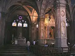 Inside the church is Andrea Orcagna's bejeweled Gothic Tabernacle (1355–59) encasing a repainting by Bernardo Daddi's of an older icon of the "Madonna and Child".[3]