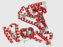 | The structure of Human serum albumin (HSA) complexed with 6 palmitic acid molecules | |