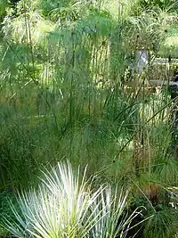 In the Aquarium many species of Nymphaea are to be found, including Nymphaea alba, Nymphaea tuberosa hybrids of Nymphaea × marliacea, the multicoloured Nuphar lutea and Nelumbum nucifera. Moreover, in the areas further in that are not submerged but humid nevertheless, one finds Alocasia, Colocasia, Zantedeschia, while in a nearby pond, the so-called laghetto, Egyptian papyrus (Cyperus papyrus) and other cyperaceae such as Scirpus lacustris and Cyperus alternifolius are absolutely thriving.