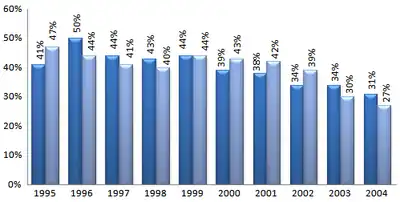 Osteopathic physicians have historically entered primary care fields at a higher rate than their MD counterparts. Some osteopathic organizations make claims to a greater emphasis on the importance of primary care within osteopathic medicine. However, the proportion of osteopathic students choosing primary care fields, like that of their MD peers, is declining.[66] Currently, only one in five osteopathic medical students enters a family medicine residency (the largest primary care field).[67] In 2004, only 32% of osteopathic seniors planned careers in any primary care field; this percentage was down from a peak in 1996 of more than 50%.[65]