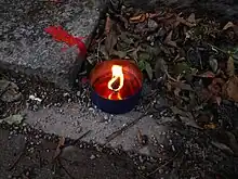 An outdoor candle,[1] which is also known a pitch torch or a garden candle[2] (Swedish: marschall, Danish: haveblus,[3] Finnish: soihtukynttilä) is a large (usually 10 cm wide) tealight-like candle that is lit outside. Outdoor candles are commonly found in Scandinavia,[4] and are used as an outdoor decoration in private gardens, graves or at the side of roads or paths. They are made from paraffin in a metal cup with a centimetre-thick wick, which heats up to 1000 °C. Due to this heat, and the fact that they are designed to be weatherproof, they have to be properly snuffed out with a snuffer.