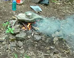 Backwood cooking is a method of cooking without the use of kitchen implements.[4] It commonly takes place in the backwoods, often in combination with wild or conventional camping. Some variants of backwoods cooking allow the use of items of cookware such as a cooking pot;[5] however there are many recipes without any. Some backwoods alternatives to cookware include aluminium foil,[4] fruit skins,[6] and heated stones.[7] Traditionally backwoods cooking takes place over a wood-burning fire because wood is the most available fuel source in the backwoods.[8] As a result, some recipes include information about the intensity of the fire to be used.[6]