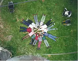 A group of Outward Bound participants with physical disabilities after completing a ropes course, c. 1996.
