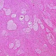 | Endometrioid tumor | 1% | Almost 100% | Tubular glands, resembling endometrium.[7] | ![]() | |