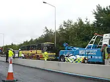 - On Thursday 10 July, a bus of forty festival-goers from Newry caught fire on a Dublin motorway en route to Oxegen. No one was seriously injured although food, clothes, tickets and camping equipment were burned in the blaze and the southbound lane of the M50 motorway had to be shut down with diversions put into place at Finglas and Ballymun, causing further traffic delays.[64][65] Those involved in the incident arrived at Punchestown in time for kick off on Friday evening, with festival organisers MCD dispatching a new bus, replacing their tickets and camping equipment and supplying food vouchers.
