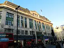 Development continued through the first half of the 20th century, with Bourne & Hollingsworth opening in 1902. When Waring & Gillow opened their new store in 1906 it became the first West End store to occupy an entire city block.[24] Selfridges opened on 15 March 1909 at No. 400;[25] it promptly had a 'transformative influence on Britain's retail scene, elevating the concept of a department store as a social and cultural institution open to everyone, with innovative window dressing, exceptional customer service and masterly advertising'.[26] Shoemakers Lilley & Skinner acquired the lease of 358–360 Oxford Street in 1914;[27] they later expanded into Nos. 356–366, reputedly becoming the world's largest shoe store in 1921.[28] In 1922 C&A purchased Nos. 376–384 (before long C&A had three stores on Oxford Street, which remained the case until their withdrawal from the UK market in 2001).[27]