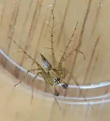 A number of authors (Brady 1964, Laster and Brazzel 1968, McDaniel et al. 1981, Young and Lockley 1985) have noted the importance of Oxyopids as a major predator of economically important agricultural pests. In 1961, Kayashima released 45,000 O. sertatus spiders into a Cryptomeria forest in Japan (in a test plot) and noted a 53% reduction in damage by the gall midge Contarinia inouyei.[3] Other studies in India (Sharma & Sarup, 1979; Rao et al., 1981) have noted similar results.[4] However, some studies note that O. salticus (and other Oxyopids) also prey on beneficial insects (e.g., bees and other pollinators), so their importance in pest control is somewhat questioned.[5]