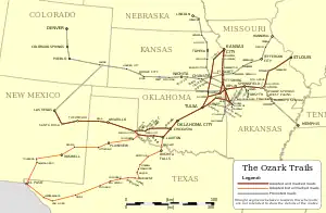 The Ozark Trail was a network of locally maintained roads and highways organized by the Ozark Trails Association that predated the United States federal highway system. The roads ran from St. Louis, Missouri, to El Paso, Texas, and Santa Fe, New Mexico, over a series of routes.[1] These roads were maintained by both private citizens and local communities. In one case, however, the U.S. government was directly involved; it built the Newcastle Bridge in 1923 over the South Canadian River between Newcastle, Oklahoma, and Oklahoma City, as the first federal highway project built in Oklahoma.[2]