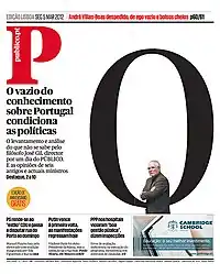 Público (Portuguese pronunciation: [ˈpuβliku]; English: Public) is a Portuguese daily national newspaper of record published in Lisbon, Portugal.