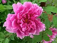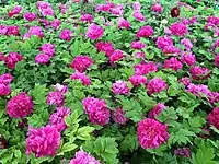 Paeonia × suffruticosa is a name used for a group of cultivars of tree peonies that are the result of hybridisation with species exclusively belonging to the subsection Vaginatae. The common name used in China is mǔdān (Chinese: 牡丹). Plants belonging to this group have been cultivated for millennia in China, initially only as a source of traditional Chinese medicine particularly the skin of its roots (牡丹皮; mǔdān pí). Already early on the plant was also cultivated for its ornamental value, and it is highly revered in Chinese culture.
