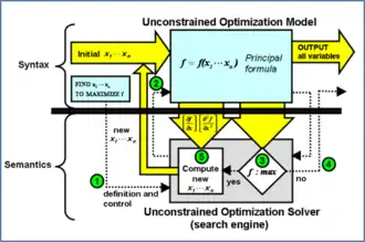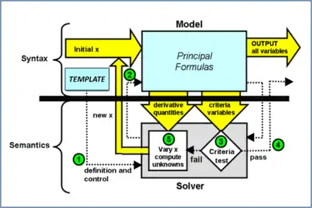 Yet semantically, this mathematical blending was considerably more complex than the mechanics of subroutines because an iterative solution engine was attached to each problem model by its calling operator template above it in the program hierarchy. In its numerical solution process, this engine would take control and would call the problem model subroutine iteratively, not returning to the calling template until its system problem was solved. During some or maybe all of the iterative model-subroutine calls, the engine would invoke automatic differentiation of the formulas in the model holarchy with respect to the model's input-unknowns (arguments) defined in the calling template. Additional mechanisms were performed in the semantics to accommodate ubiquitous nesting of these holistic models.