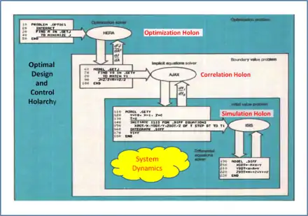 These three operator templates created dynamic holons encapsulating an equations model subroutine hierarchy which could contain other nested holons, because the model subroutines could contain any of the operator templates encapsulating sub-problems. Each holon in the holarchy had a solver algorithm engine, which could be interchanged with others in its holon class. The extended arithmetic of automatic differentiation and its ability to dynamically differentiate numerical integration gave rise to the unique mode of holarchy modeling illustrated in Figure 1.