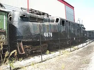 The reconstructed 4876 was returned to DGLE, single stripe by 1956. It remained in service for approximately 30 more years with the PRR, Penn Central, Conrail and finally New Jersey Transit. In 1983 the locomotive was retired and donated for preservation. Originally slated for donation to the Smithsonian Institution, it was ultimately donated to the B&O Railroad Museum in Baltimore, Maryland.[12][13] Originally, the museum planned on cosmetically restoring 4876 and putting it on static display. These plans were placed on hold indefinitely when the museum's roundhouse roof collapsed in 2003, and the museum focused its efforts on restoring the equipment damaged by the collapse.[14][15] Since the inquisition, the locomotive has been stored outside since it was acquired by the museum. It has become defaced with graffiti and parts of its steel body have corroded.[15]