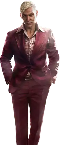 According to Far Cry 4 narrative director Mark Thompson, Min took the name of a historical Burmese king from the 19th century after the death of his father, because he did not want to say that he killed his own father, but named himself after the man who did.[2] Min changed the pronunciation to be western to assert his identity as unique.[3] He then assumed control of his family’s modest fortunes to acquire considerable assets and assemble a small private army to make a grab for power and dominance within the Golden Triangle, a geographical location between Myanmar, Laos and Thailand known for being one of the world’s largest regions of opium production.[2] Min's downfall came when his father's allies attempted to assassinate him, forcing him to flee to Kyrat and seek refuge there while it was in the midst of a civil war.[2] Driven by delusions of grandeur and hubris, a 21-year-old Pagan Min participated in the conflict on the arrogant belief that he could save the country from its status as a failed state, and ended up usurping the throne of Kyrat.[2] He rules Kyrat through a "toxic mixture of personal charm, relentless propaganda, criminal sponsorship, and brutality".[4] Pagan Min consistently wears a brightly colored suit, variously described as pink or magenta, as a homage to his unnamed mother, who was a British expatriate in Hong Kong.[5][6]