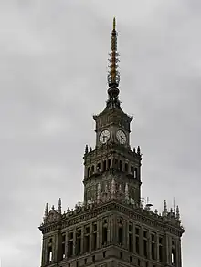 The Palace of Culture and Science (Polish: Pałac Kultury i Nauki;[lower-alpha 1] abbreviated PKiN)[lower-alpha 2] is a notable high-rise building in central Warsaw, Poland. With a total height of 237 metres (778 ft), it is the second tallest building in both Warsaw and Poland (after the Varso Tower), the sixth tallest building in the European Union and one of the tallest in Europe.[1] At the time of its completion in 1955, the Palace was the eighth tallest building in the world, retaining the position until 1961; it was also briefly the tallest clock tower in the world, from 2000 until the 2002 installation of a clock mechanism on the NTT Docomo Yoyogi Building in Tokyo, Japan.[2]