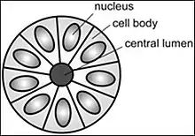 A rosette is a cell formation in a halo or spoke-and-wheel arrangement, surrounding a central core or hub. The central hub may consist of an empty-appearing lumen or a space filled with cytoplasmic processes. The cytoplasm of each of the cells in the rosette is often wedge-shaped with the apex directed toward the central core: the nuclei of the cells participating in the rosette are peripherally positioned and form a ring or halo around the hub.[2]