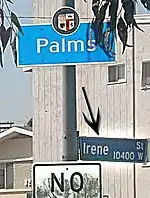 The portion of Palms girded by Overland, Sepulveda, National, and Charnock Road was developed just before World War II as Westside Village. The City of Los Angeles has posted official neighborhood signs for Westside Village, and it has its own homeowners association: the Westside Village Homeowners Association.[27]