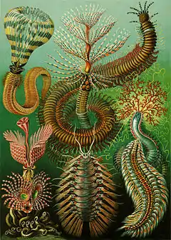 Palpata includes the majority of genera and species of polychaete worms and is subdivided into the orders Aciculata and Canalipalpata.[2] The prostomium is characterised by a pair of sensory palps which gives the subclass its name and which are lacking in the other main taxon of polychaetes, the Scolecida.[3]