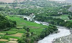 The Panjshir River flows through the Panjshir Valley in northeastern Afghanistan, 150 kilometres (93 mi) north of Kabul. Its main tributary is the Ghorband River which flows from the Parwan Province and joins the Panjshir River 10 km east of Charikar in Bagram District. The Panjshir River takes its source near the Anjuman Pass and flows southward through the Hindu Kush and joins the Kabul River at the town of Surobi.[1] A dam was built on the Panjshir River near Surobi in the 1950s to supply water from the Panjshir River to the Kabul River.[2] There is just one permanent bridge on the Panjshir River that provides access to the Bagram Airport.[3][4] On 12 July 2018, there was a flood in Panjshir Valley in which ten people were killed.[5][6]