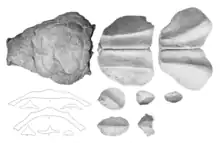 Armour from the neck and trunk of Panoplosaurus, some of it still in articulation with bones, is known. A gradient of sizes exist from plate-like paired elements through to indistinct ossicles. Where they have a distinct shape, the osteoderms are keeled, with the strength of the keel dependent on location. Lambe identified 7 different categories of osteoderms in his 1919 description of Panoplosaurus. The first kind was large, paired elements with a low keel, which formed bands around the neck leading from the head. On the sides of the neck to the back was a second kind, individual elements that were slightly smaller, suboval, and had a strong keel. Small, keeled scutes with a thick base were identified as the fourth osteoderm type, occurring on the underside of the base of the neck forwards to the chin. A fifth kind of osteoderms was identified as small, polygonal elements that fit together along the underside of Panoplosaurus, slowly grading into the larger rectangular elements of category two on the sides. Small irregular scutes lacking a keel were identified as a sixth form, and were suggested to have been from the limbs, though this was not definitive. The final form of scute were small ossicles, which occurred all over the animal filling in gaps between the larger osteoderms.[1] The scutes along the top and sides of the neck in Panoplosaurus are the most distinct form, differing significantly from the corresponding elements in Edmontonia. Three bands of cervical osteoderms were present in both genera, consisting of rounder plates that united on the midline of the animal, and one narrower element on each side with a sharp keel. In Panoplosaurus both the first and second bands of neck osteoderms had a third pair, lower on the side of the animal, again possessing a sharper keel than the elements on the top of the neck. While Edmontonia possesses lateral spines on the rear neck and shoulders, these are absent in Panoplosaurus. The arrangement of the armour on the torso and tail of Panoplosaurus is unknown, as no elements were found in articulation or association with this region of the skeleton.[2]